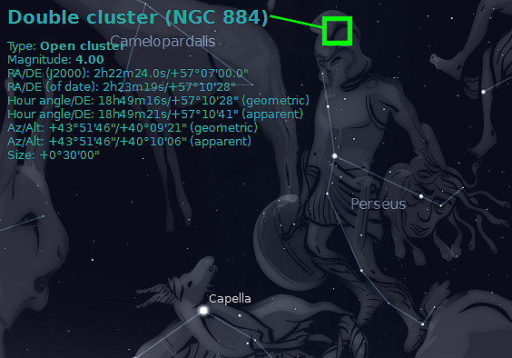 Esta libélula se encuentra en la Constelación de Perseus y obviamente donde el Doble Cúmulo (NGC 869 y NGC 884), en la cabeza de Perseo: